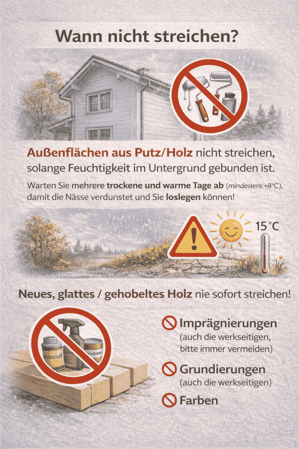 Streichen Sie daher keine Außenflächen aus Putz oder Holz in der Zeit von Herbst bis Frühjahr, wo reichlich Feuchtigkeit in den Untergrund eingedrungen sein kann. Mehrere Tage trockenes und auch warmes Wetter ziehen die Nässe wieder heraus und man kann loslegen.